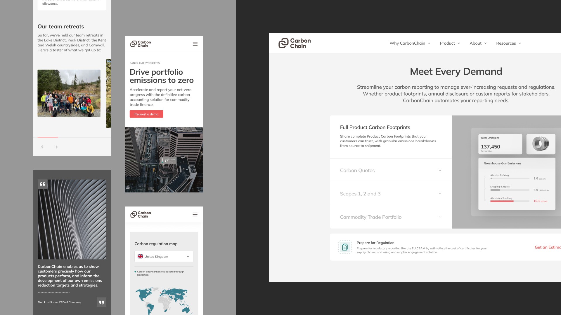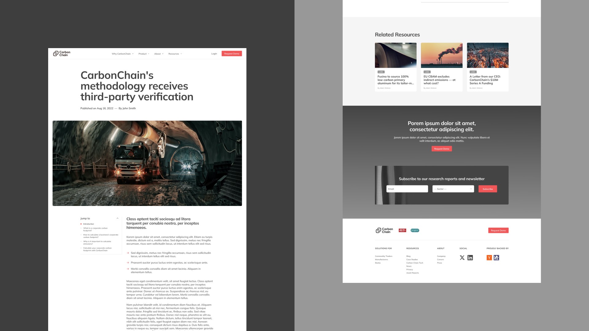 CarbonChain is a climate-tech company helping organizations measure, report, and reduce emissions across complex global supply chains—especially in carbon-intensive industries like metals, mining, oil & gas, and agriculture. Working alongside my lead and Creative Director at RocketAir, I supported a redesign to elevate the site’s structure and visual system, making CarbonChain’s emissions intelligence platform easier to understand and more compelling for enterprise decision-makers.